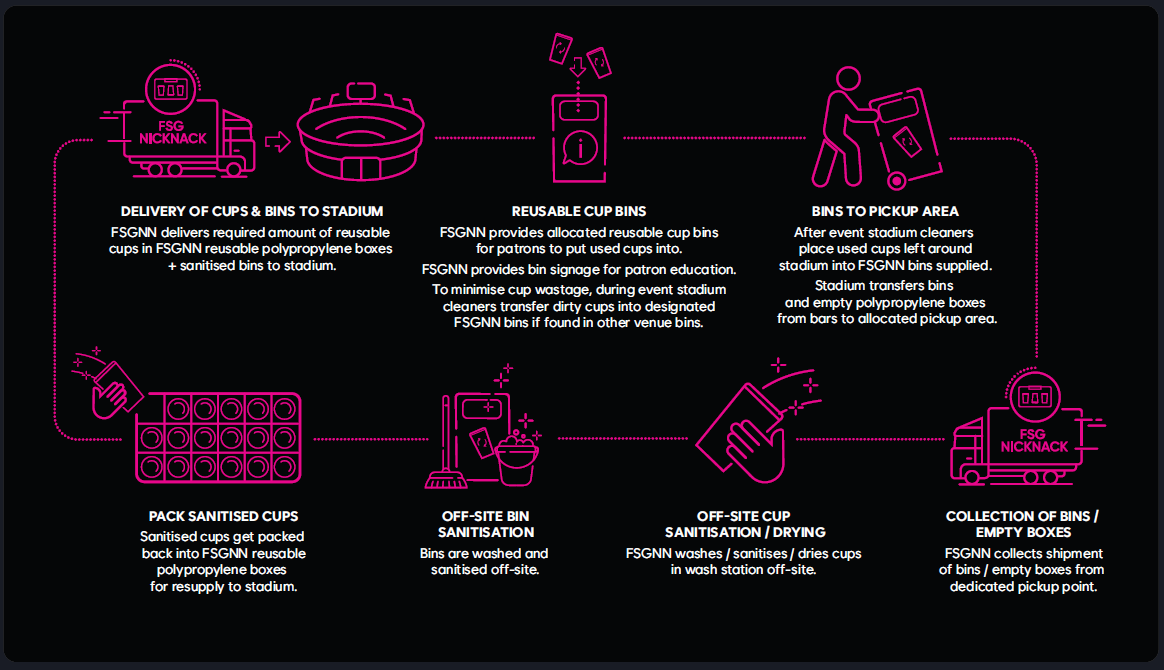 After enjoying your drink, simply return your cup to a designated reusable cup bin. All cups are collected after the event, then washed and sanitised offsite by FSG NickNack before being reused at future games and events.